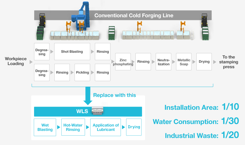 WLS stands for "Wet blasting and dry-in-place type lubricant coating (Wetblast Lubricant System)." Our proprietary technology integrates degreasing, removing oxide scale and lubrication treatment for the cold forging process.